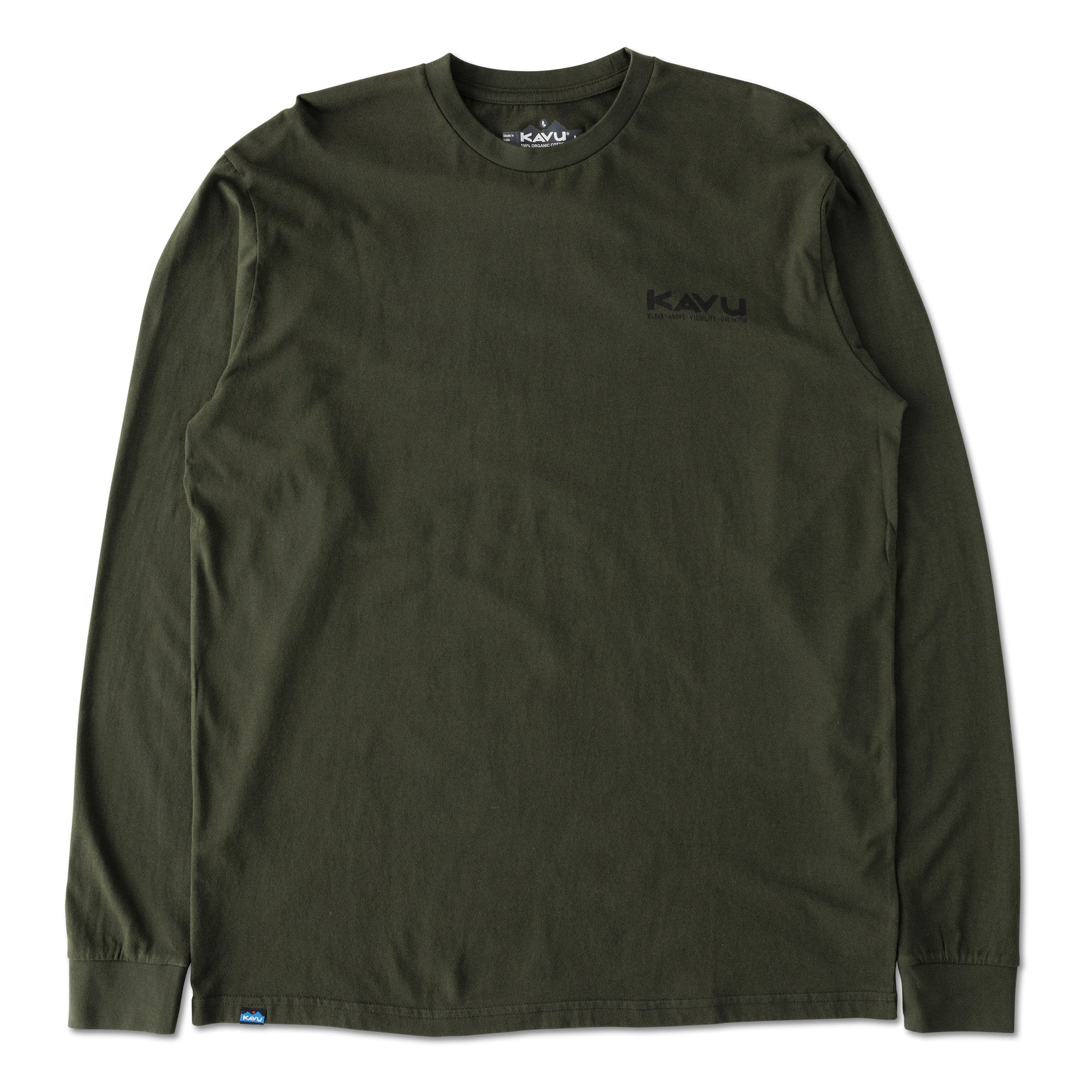 This is the Long Sleeve Klear Above Etch Art T-Shirt—a super-comfortable everyday tee made from 100% organic cotton. On the front there’s a little logo, then on the back there’s a big full colour one—both nod to our name, and the story behind it. For those unaware, KAVU stands for Klear Above, Visibility Unlimited—an aviation term that basically means it’s going to be a great day for flying. It goes without saying every day is a KAVU day with this tee on.