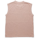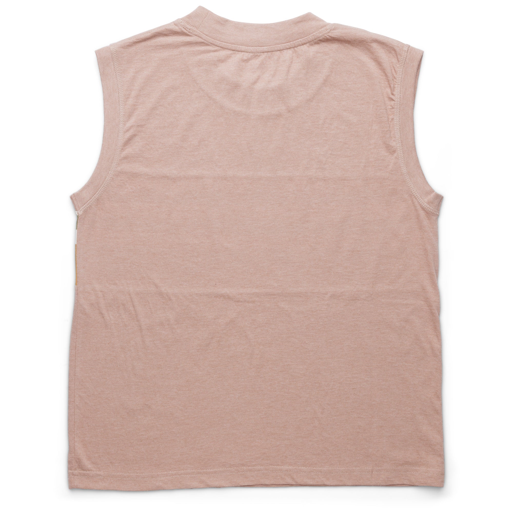 - "Muscle tank" vibes and wide crew neckline with ribbed neck and armhole trim.